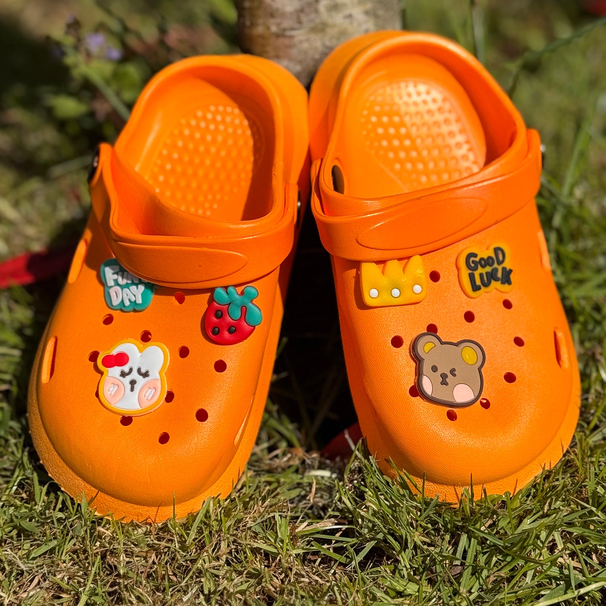 Laat je kind stralen met deze oranje kinderklompjes vol vrolijke figuurtjes!